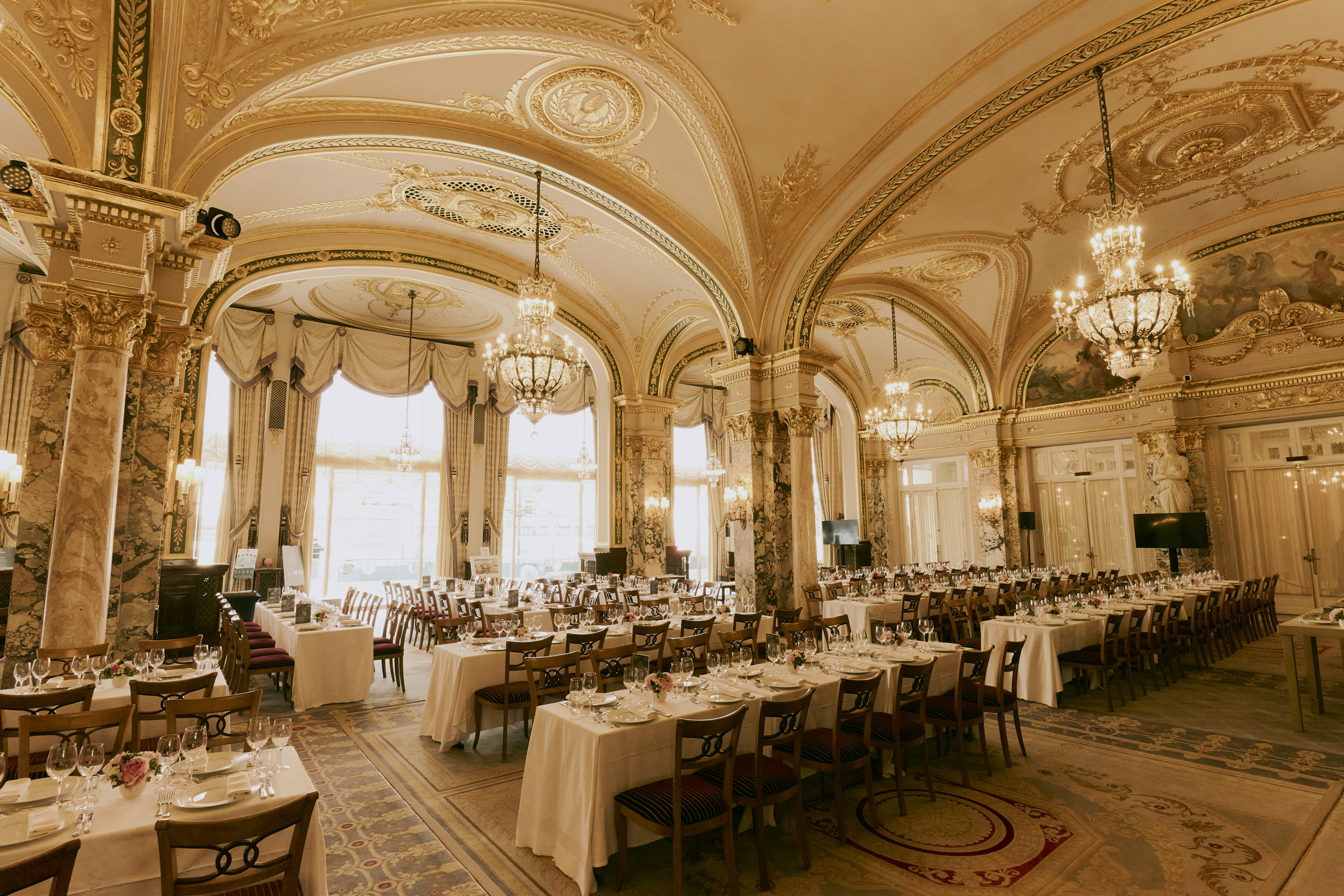Experience F1® at the Hôtel de Paris. Enjoy gourmet cuisine and champagne with fellow racing enthusiasts, all set against the backdrop of Casino Square. The ground-floor terrace offers a unique view as cars race through the square, with a giant screen opposite. All guests will be seated inside the grand Salle Empire ballroom for the buffet lunch. The event includes a morning coffee break and pastries, followed by an open bar from 11 am, featuring champagne, fine wines, and spirits. Former F1® drivers and personnel will take the stage to discuss the upcoming race while the DJ and musical acts create an exciting atmosphere.
